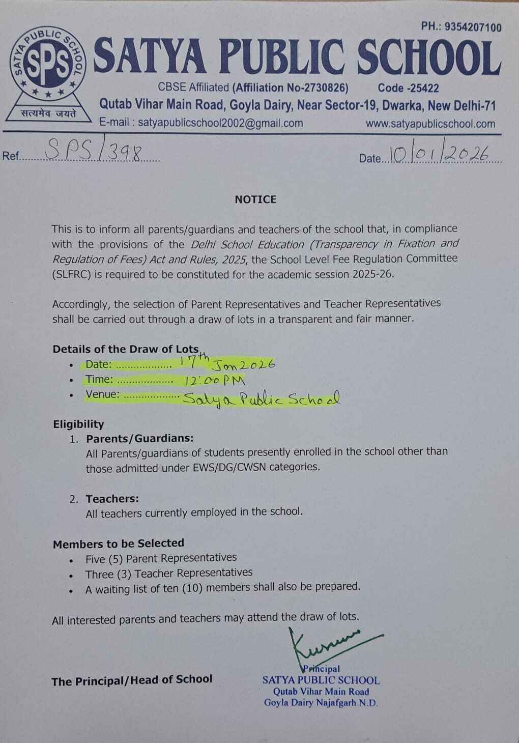 Draw for School level fee regulation committee(SLFRC) 2025-26